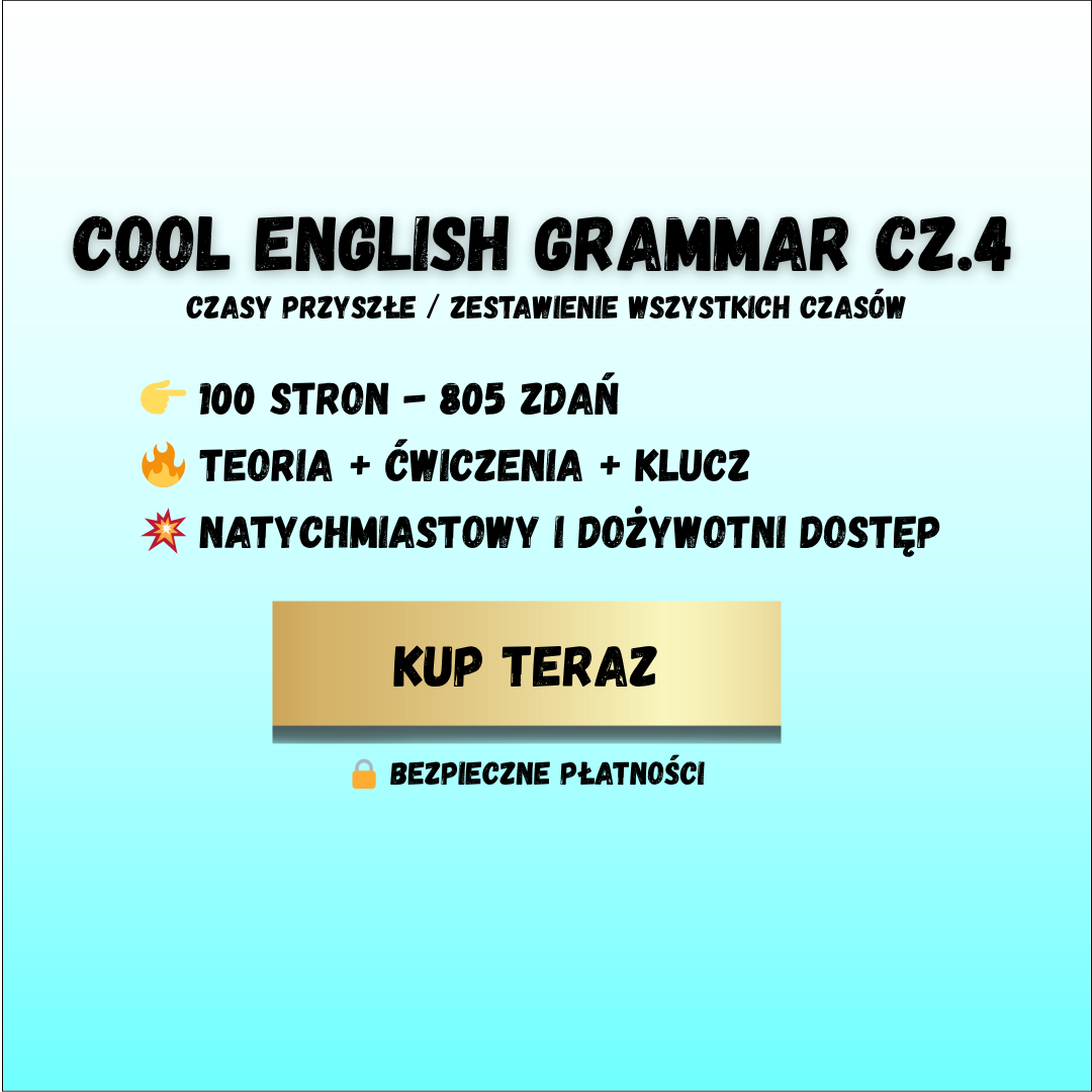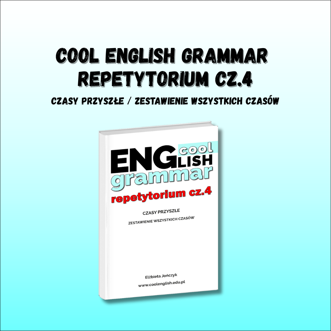 Cool English Grammar Repetytorium cz.4 – czasy przyszłe / zestawienie wszystkich czasów to e-book PDF stworzony dla osób, które chcą nauczyć się używać czasów przyszłych w języku angielskim i które chcą nauczyć się rozróżniać wszystkie czasy w języku angielskim. To kompletny samouczek angielskiego, dzięki któremu nauczysz się bez nauczyciela i będziesz mógł samodzielnie tworzyć poprawne zdania po angielsku.