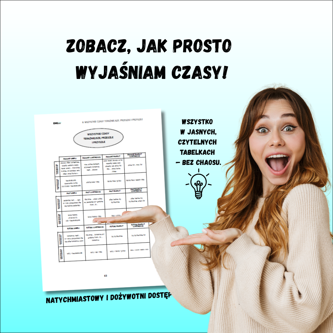 - ✅ Genialne tabelki zestawiające/porównujące czasy – super technika na rozróżnianie czasów.
