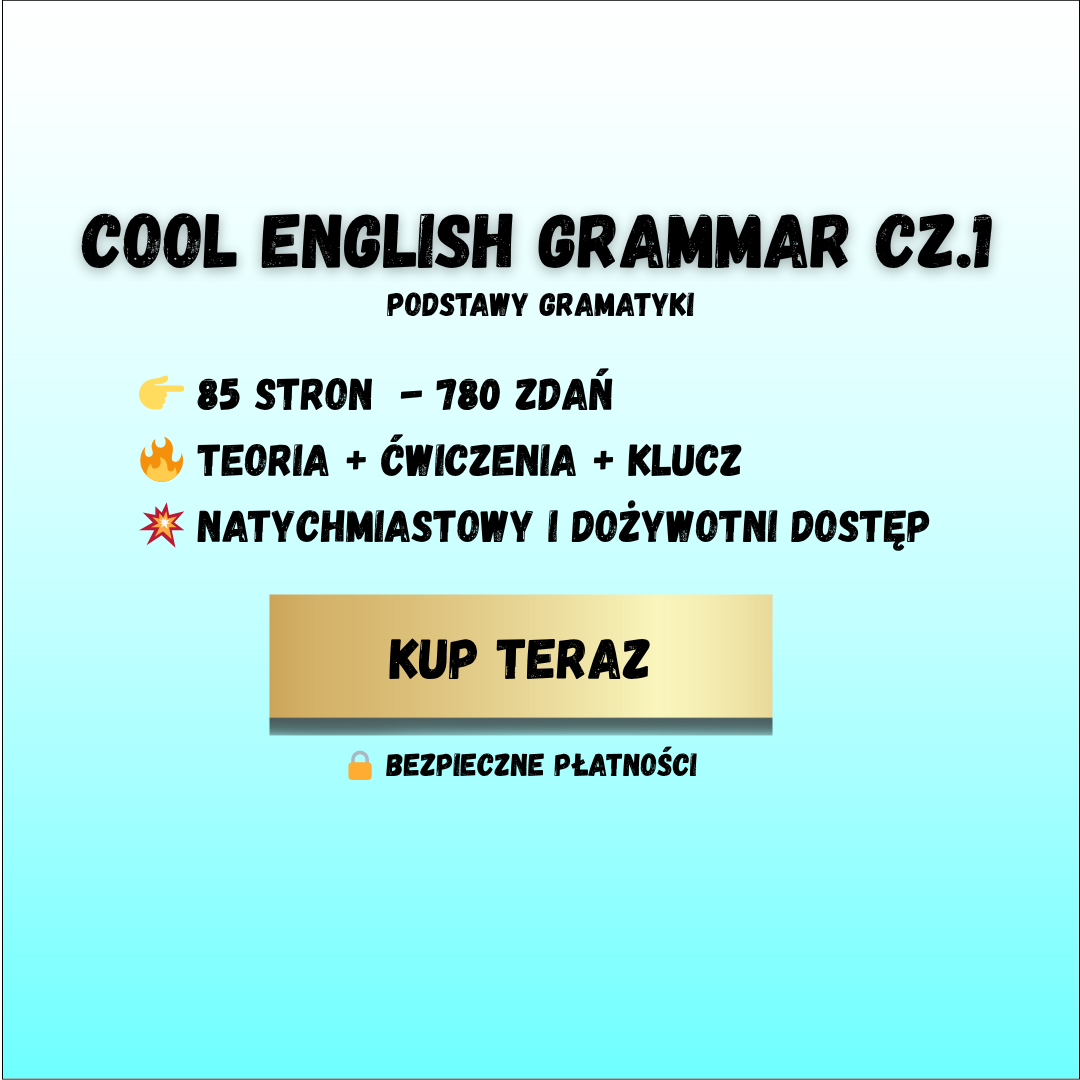 Cool English Grammar Repetytorium cz. 1 – podstawowe zagadnienia gramatyczne to e-book PDF stworzony do samodzielnej nauki języka angielskiego od zera. Materiał prowadzi krok po kroku przez najważniejsze struktury gramatyczne potrzebne do budowania poprawnych zdań po angielsku.