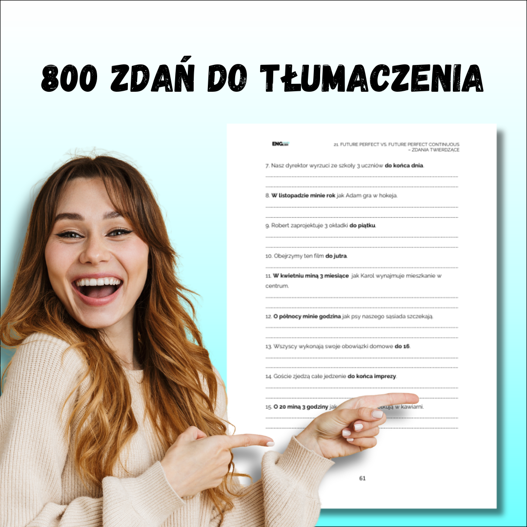 Czasy przyszłe w angielskim w tłumaczeniach – e-book PDF (Tłumaczenia cz.4) to praktyczny materiał do samodzielnej nauki angielskiego, który pomaga przećwiczyć budowanie zdań w czasach przyszłych poprzez tłumaczenie zdań.