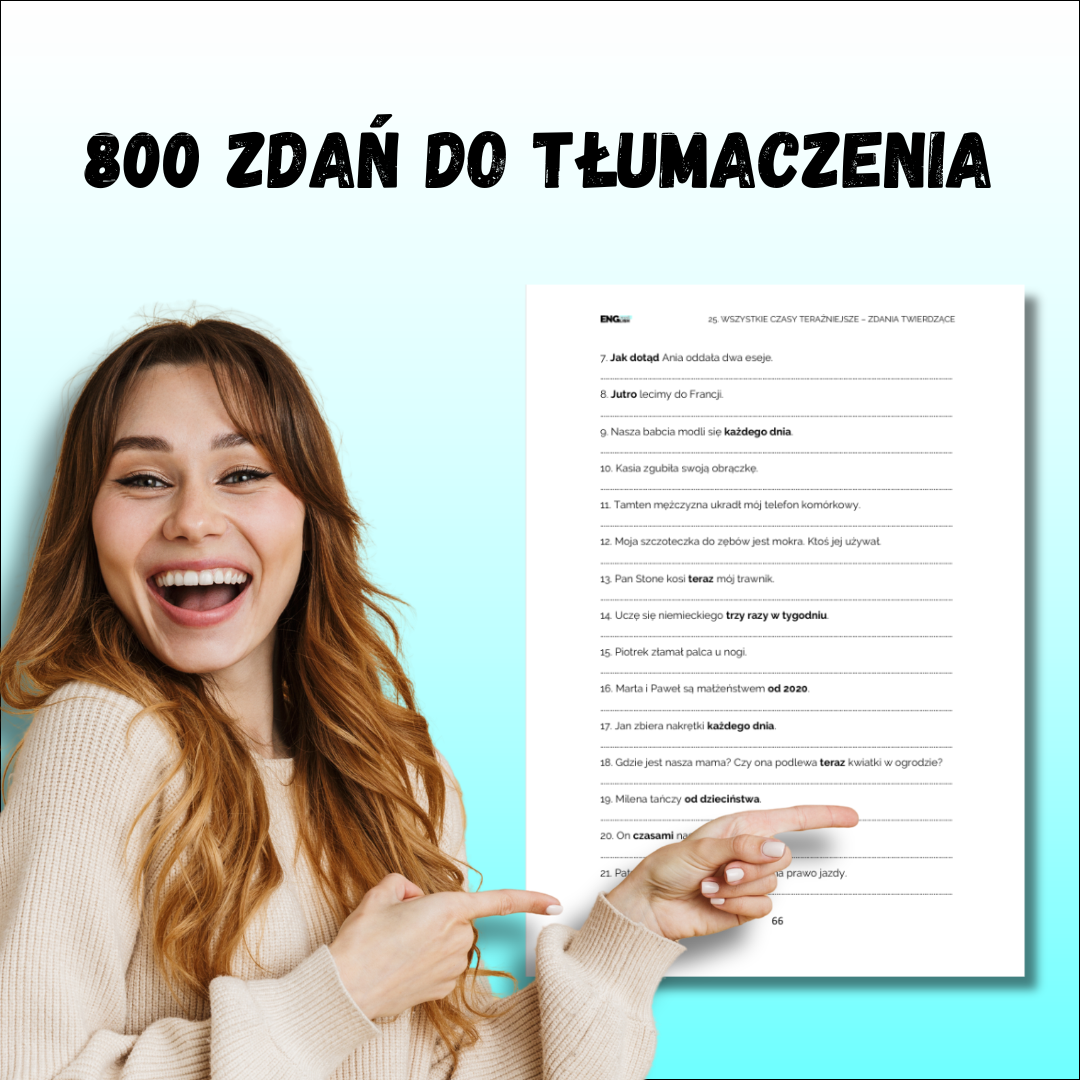 Uczysz się czasów teraźniejszych w praktyce, a nie tylko czytasz teorię. Korzystasz z gotowych schematów zdań, ćwiczysz budowanie zdań krok po kroku, porównujesz podobne czasy, tłumaczysz aż 800 zdań i sprawdzasz odpowiedzi w kluczu. Dzięki temu zaczynasz naprawdę używać czasów teraźniejszych, zamiast tylko zapamiętywać zasady.